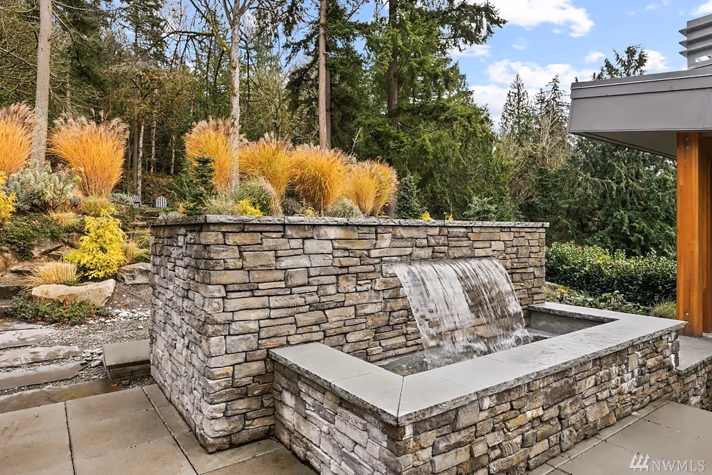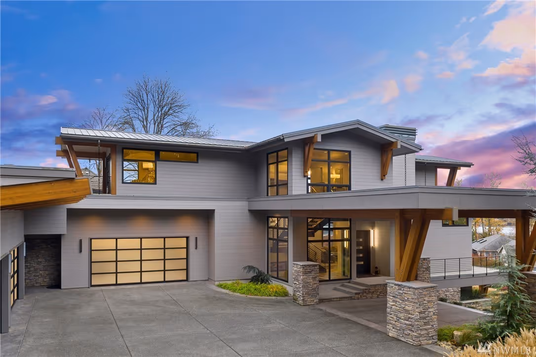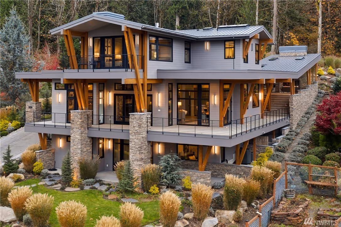 This custom waterfront home showcases strong architectural lines, exposed timber structure, and a multi-level design built directly into the natural hillside terrain.