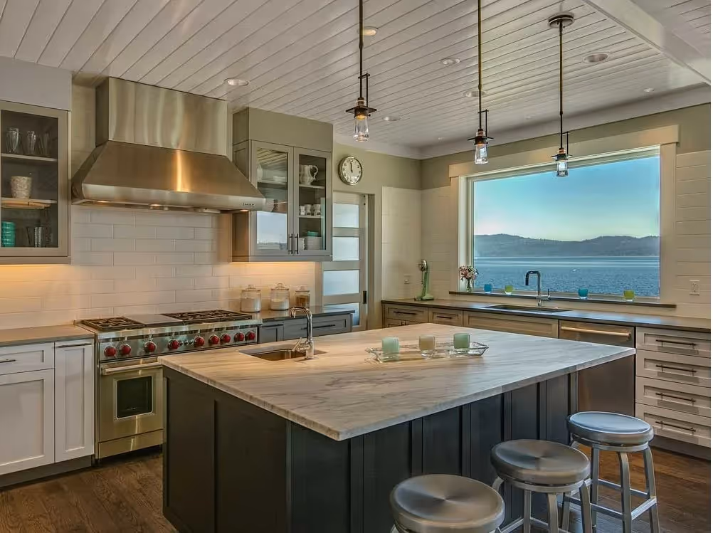 This custom waterfront home combines timeless architectural design with modern building techniques to create a warm, inviting retreat along the shoreline.