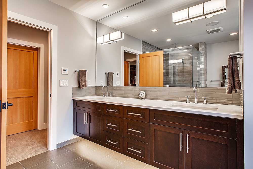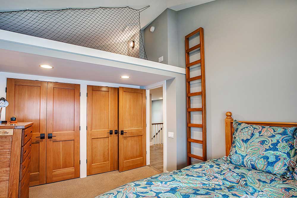 - Custom wood ceiling with integrated lighting and ceiling fan