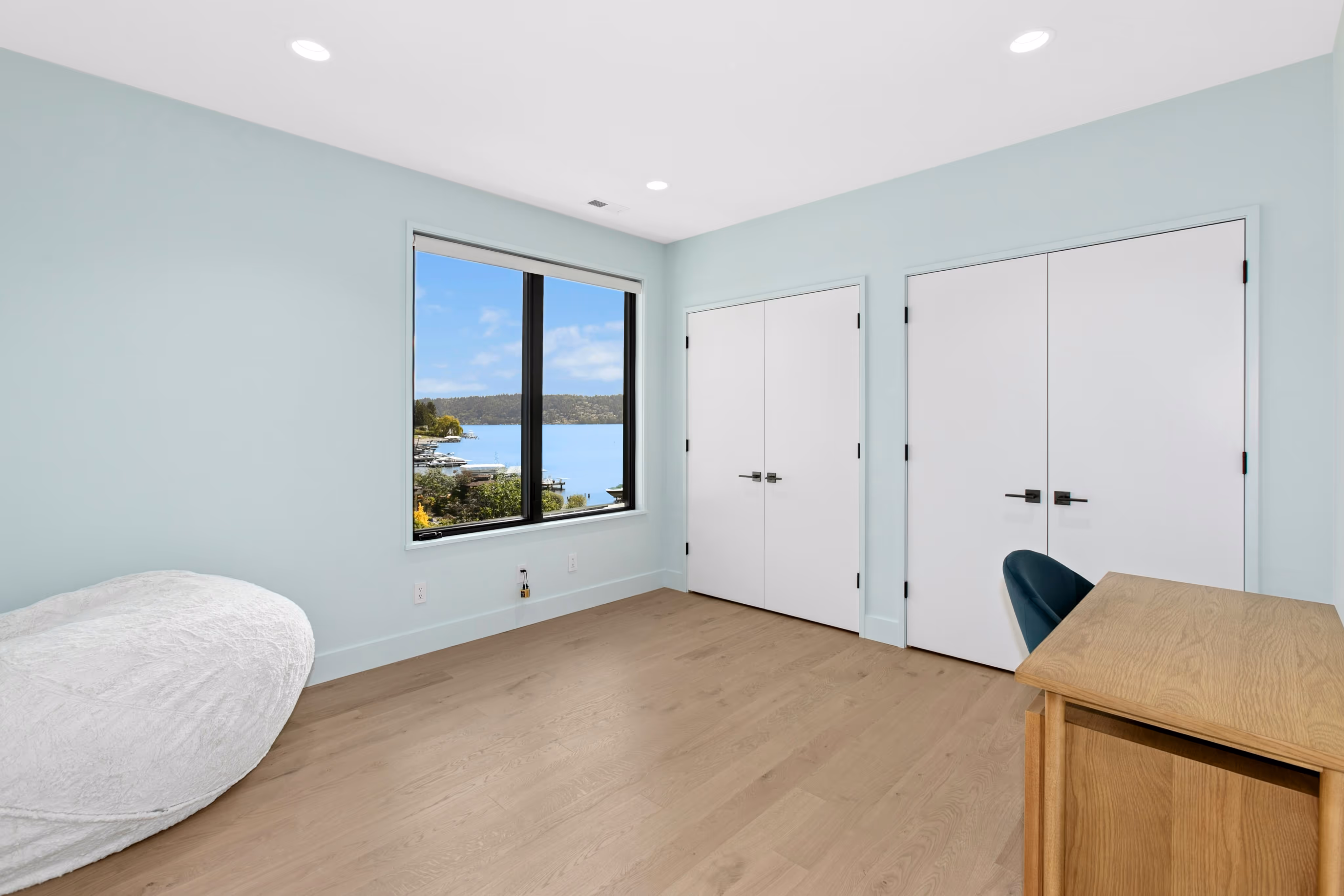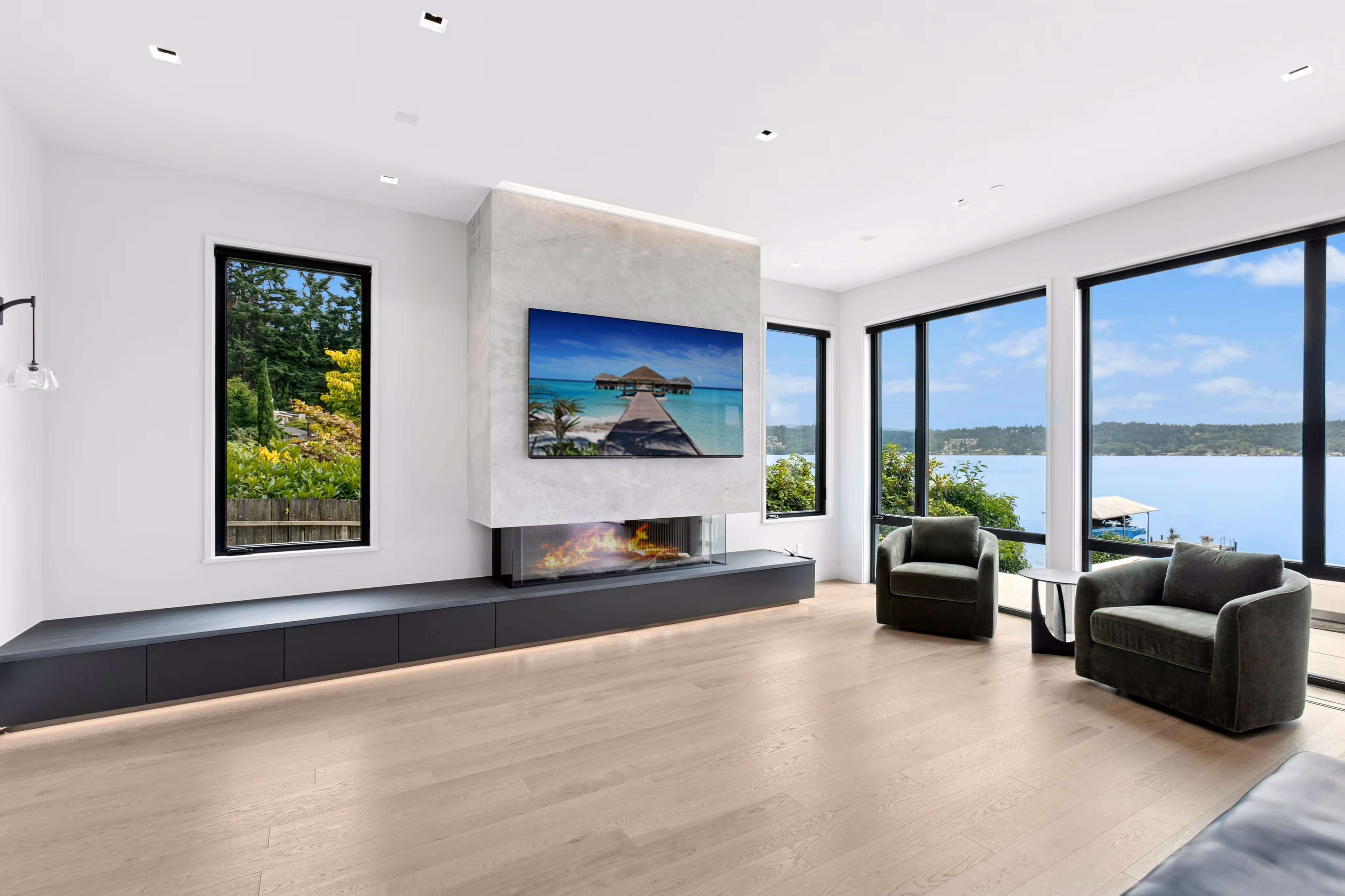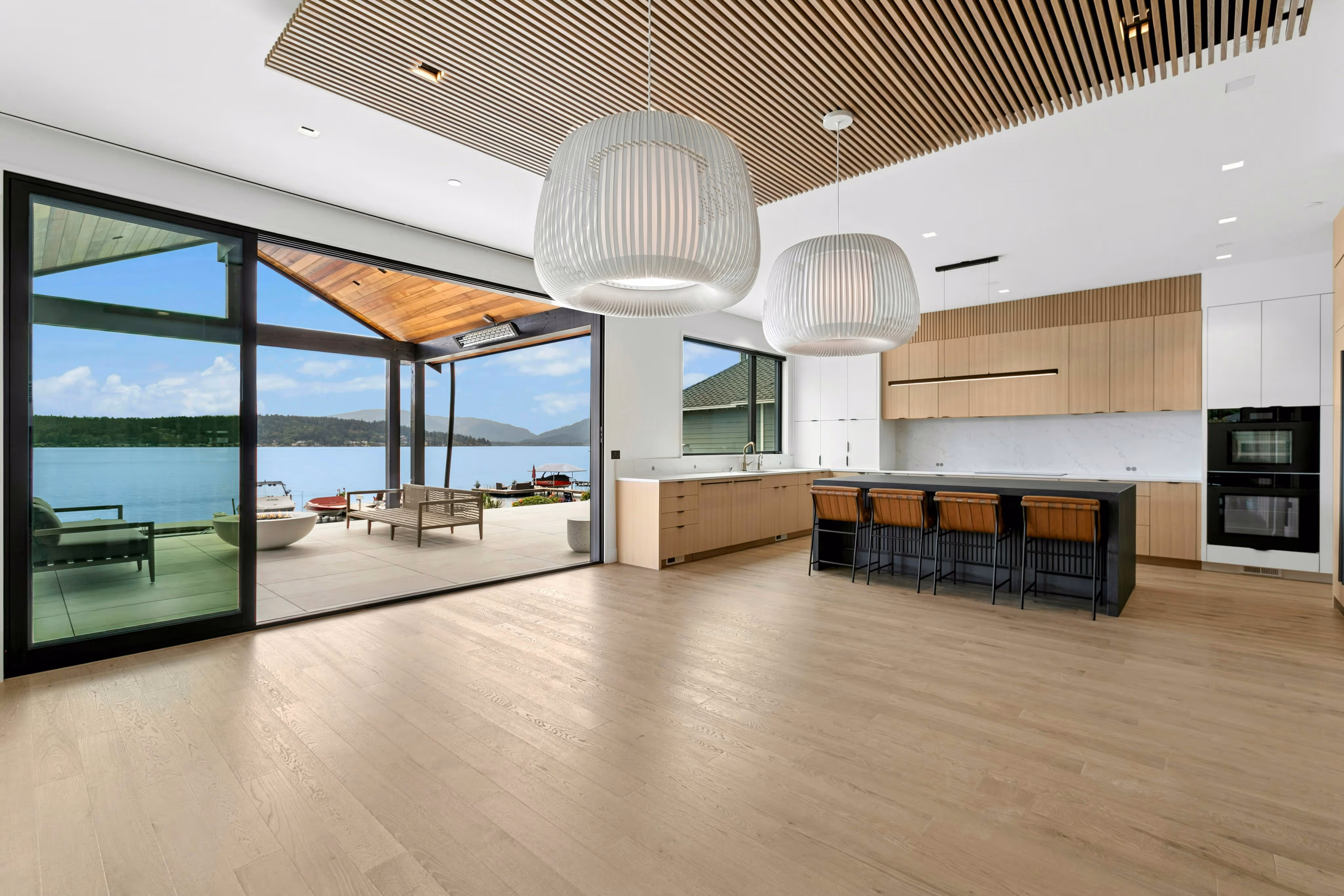 This new construction waterfront home features a bright, open living and kitchen layout oriented directly toward the lake.