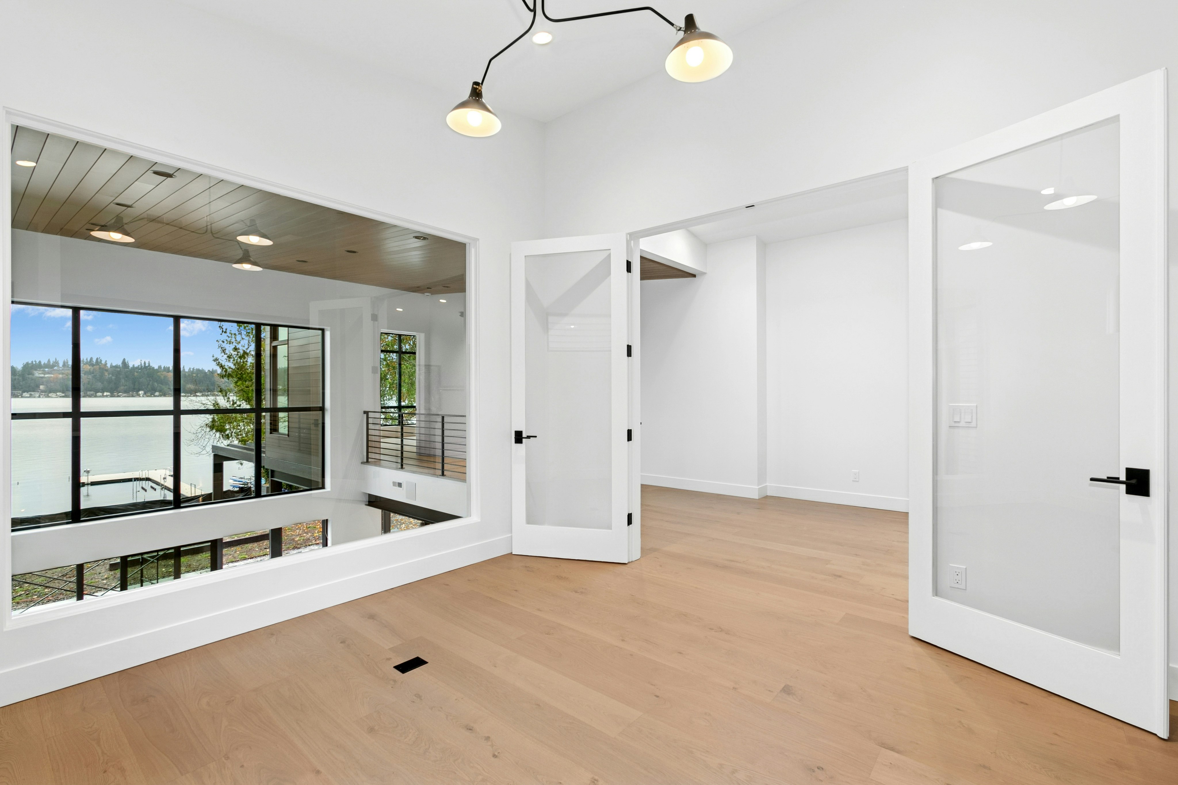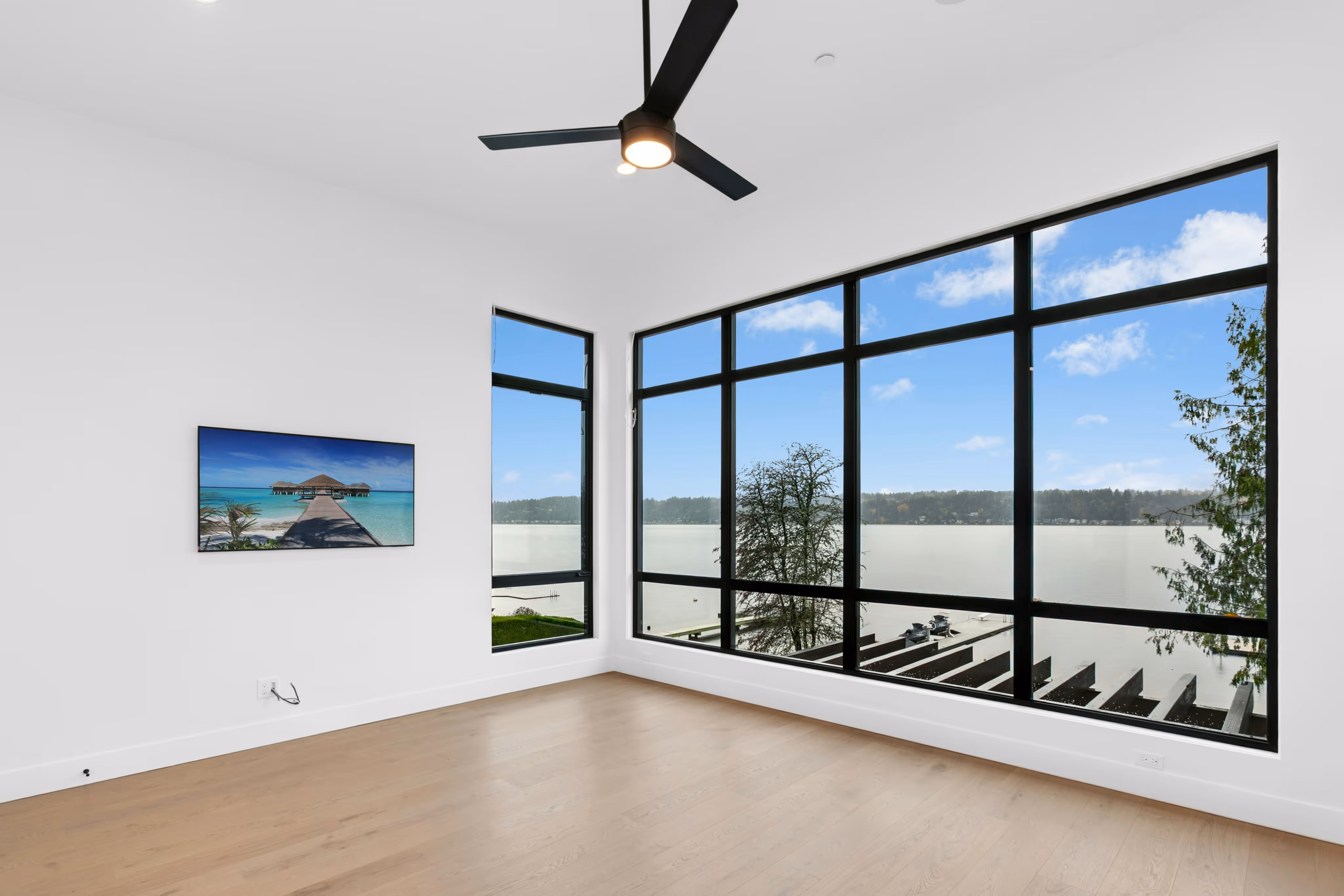 This custom waterfront home features natural light,visual openness throughout the home, and seamless indoor-outdoor living.
